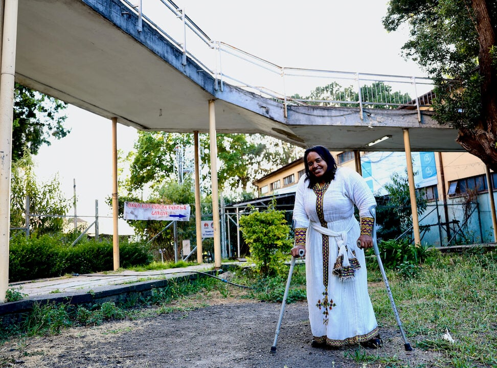 Kuvassa on Hellen Abdulshikur, liikuntavammaisten oikeuksia ajavan Inclusive Ethiopian toinen perustaja. Hellen sairastui 3-vuotiaana polioon ja eli lapsuutensa isoäitinsä suojissa. Hän menestyi koulussa ja pääsi yliopistoon opiskelelmaan hallintotieteitä. Liikuntavammaiselle arjen liikkuminen oli vaikeaa, myös yliopistolla, ja Hellen perusti kollegansa kanssa järjestön, joka edistää esteettömyyttä kaupunkisuunnittelussa.